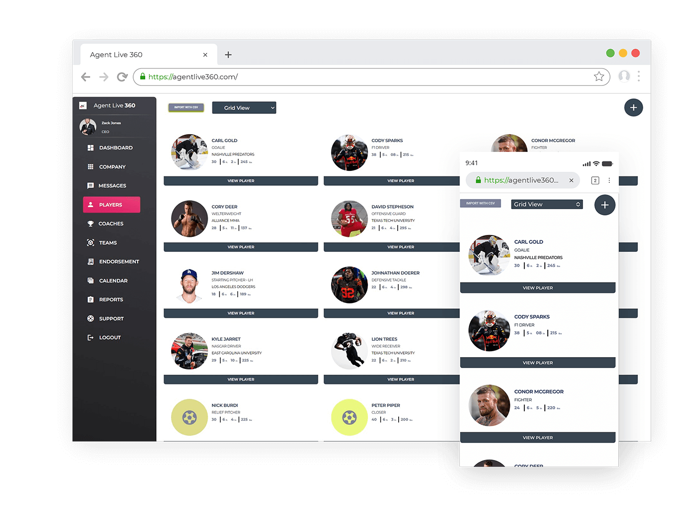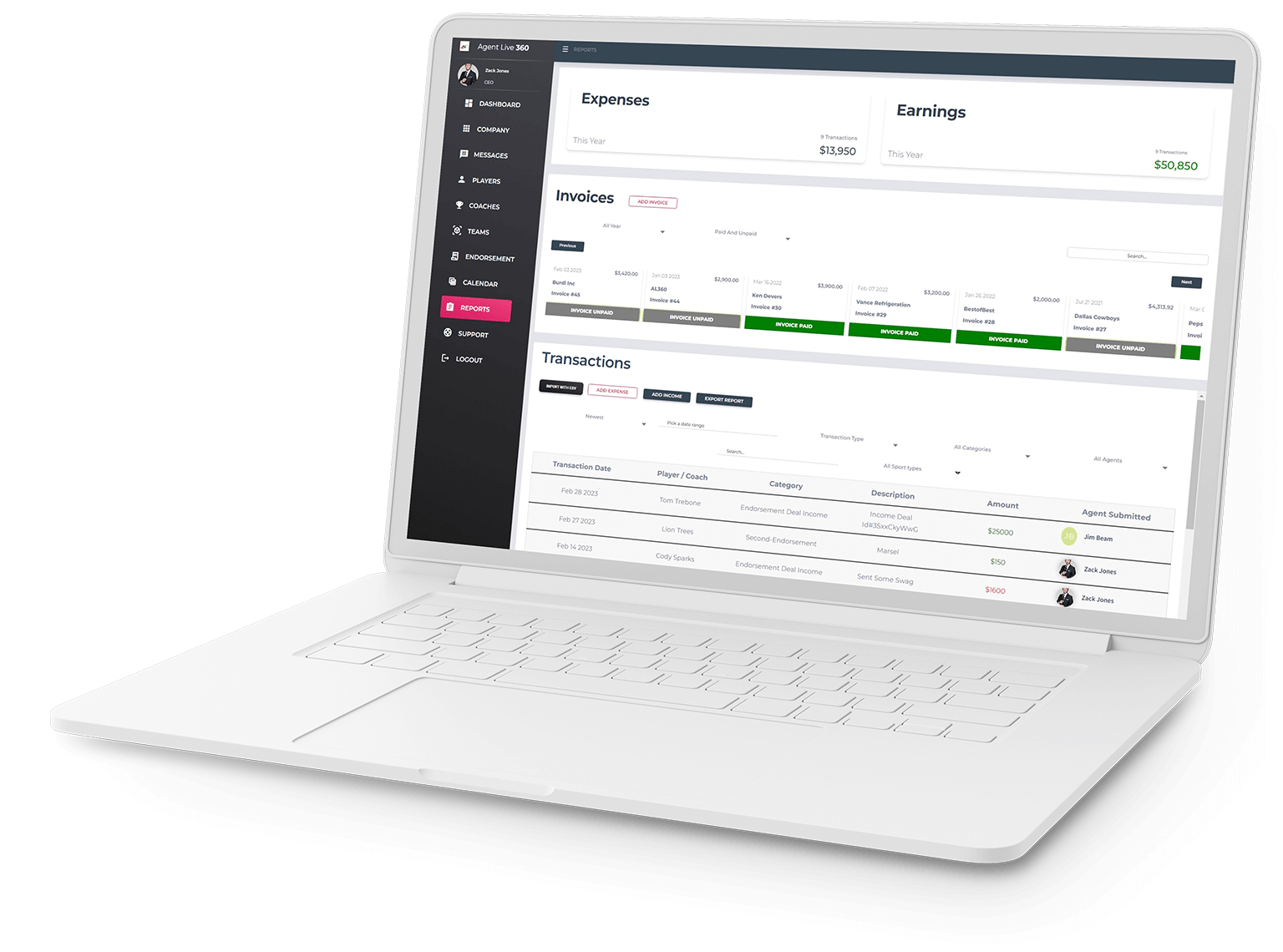 Agent Live 360 is the first publicly offered software designed specifically for sports agents and agencies. From tracking your current clients, recruiting new ones, keeping company expenses, invoicing, college/pro team staff rolodex, contract and files storage, and return on investment totals on clients.